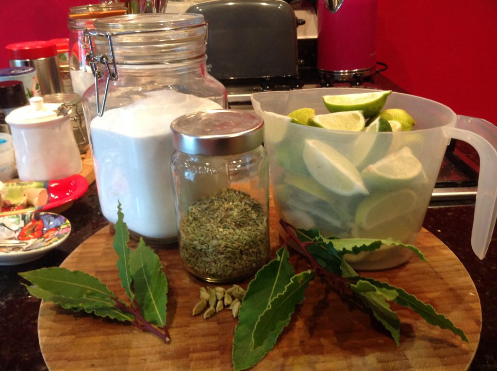 Same concept as preserved lemons. Scrub the limes well and quarter. Into sterilised jars layer salt and limes packing tightly. Add any herbs and spices you wish. I added a bay leaf, some fennel seeds and a couple of cardamon pods to each jar. Top up the jars with lime juice and seal tightly. Store in a cupboard for around 4 weeks and use in the same way as preserved lemon.